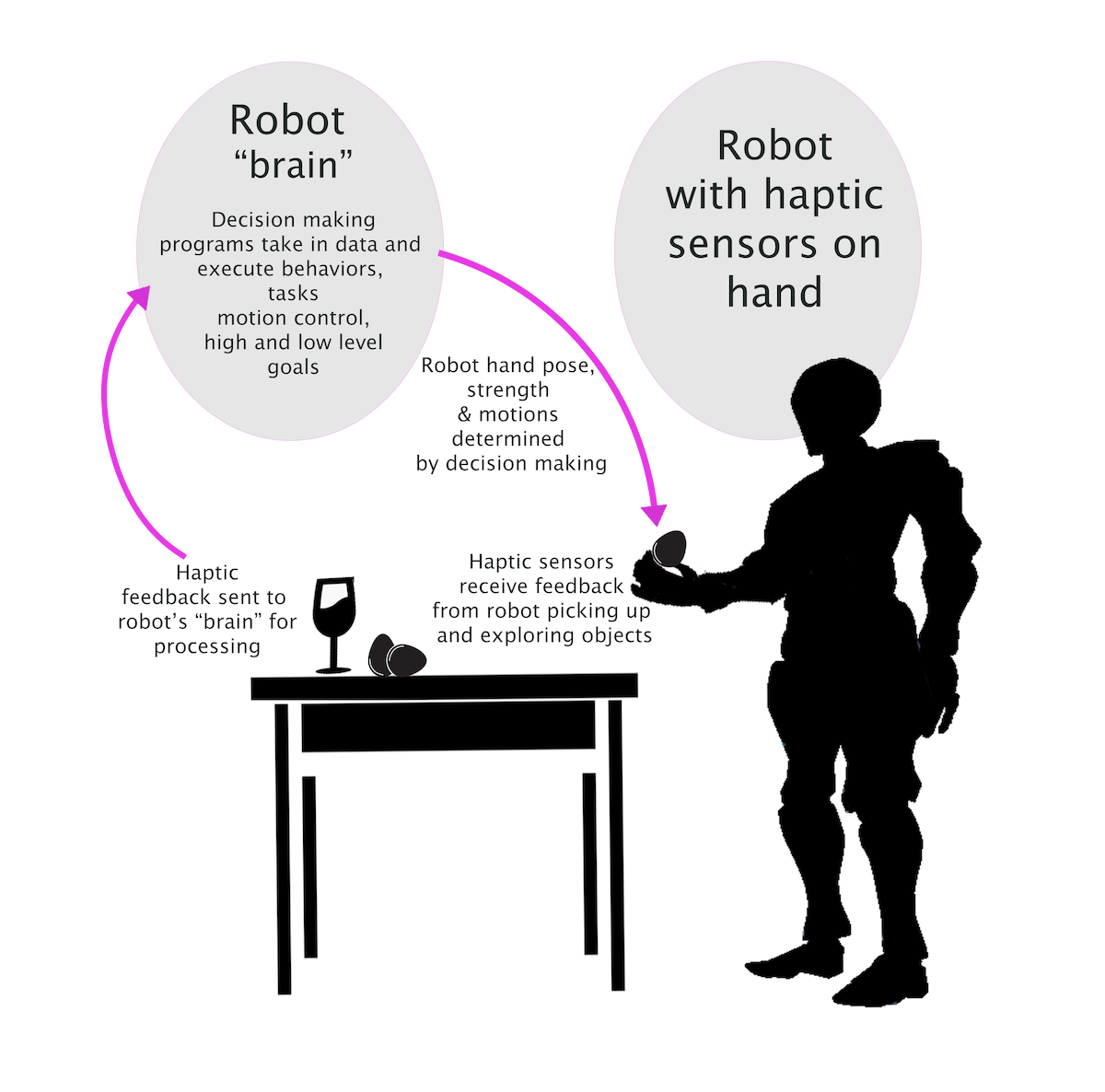 A typical robot includes programming that takes in haptic data –such as shape, texture, weight, temperature, and surface strength– processes it, and then determines what its next actions should be. The loop between these sensors and the way the robot ultimately executes actions must be finely coordinated and, especially with haptics sensors, this linking of sensing to action requires a detailed closed loop sensorimotor control system. Modern robots include such loops to determine ongoing actions. This is what allows them to be autonomous. (See Figure 1)