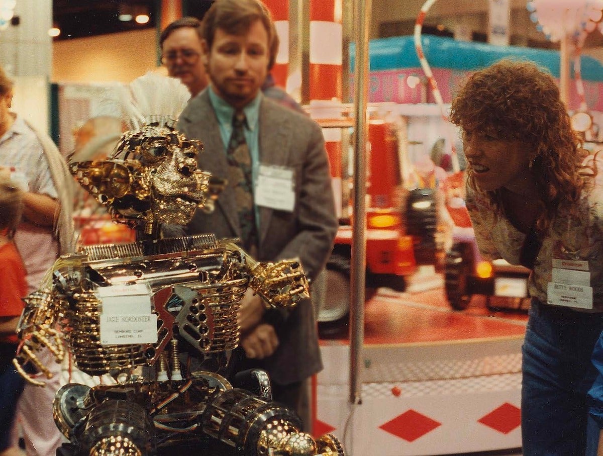 Figure 2: A human controlled robot character at the 1991 IAAPA Expo in Orlando, FL. The human is in another room, taking in visual and audio data from the robot to determine what to do or say next.