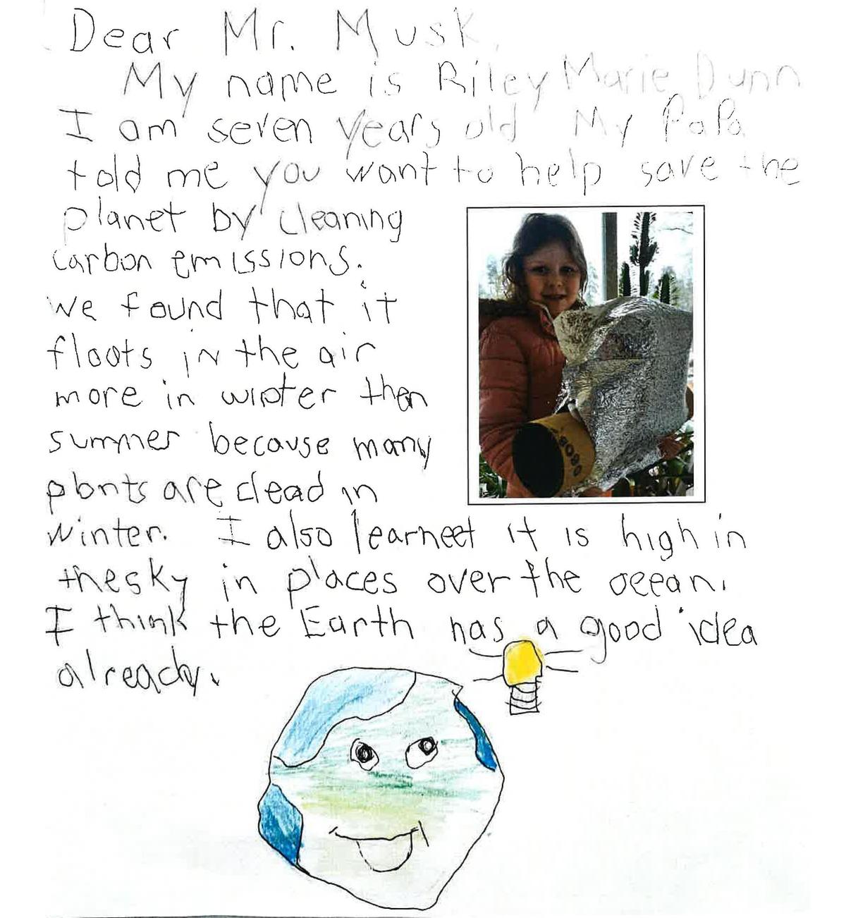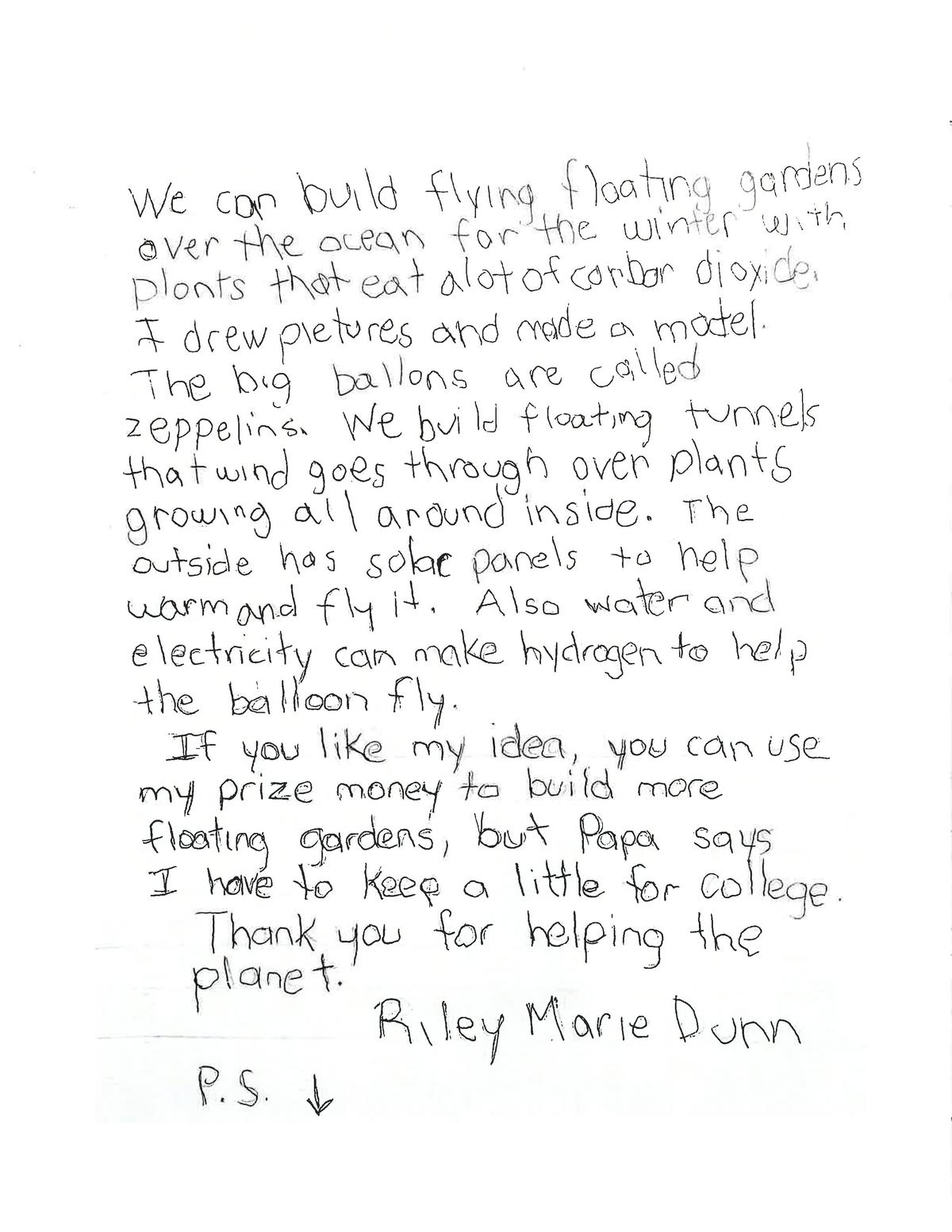 May 20, 2021Aspiring scientist, seven year old Riley Marie from Virginia sent us the detailed letter below, complete with a flying floating garden model to boot! Check out her carbon removal solution and send us your crazy ideas at [email protected]