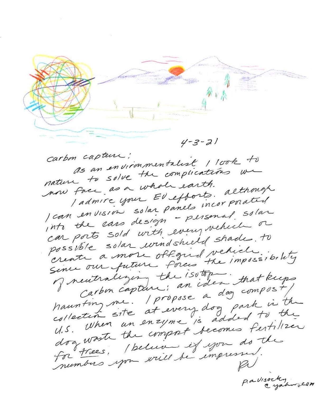 Carbon capture: an idea that keeps haunting me. I propose a dog compost / collection site at every dog park in the U.S. When an enzyme is added to the dog waste the compost becomes fertilizer for trees. I believe if you do the numbers you will be impressed.